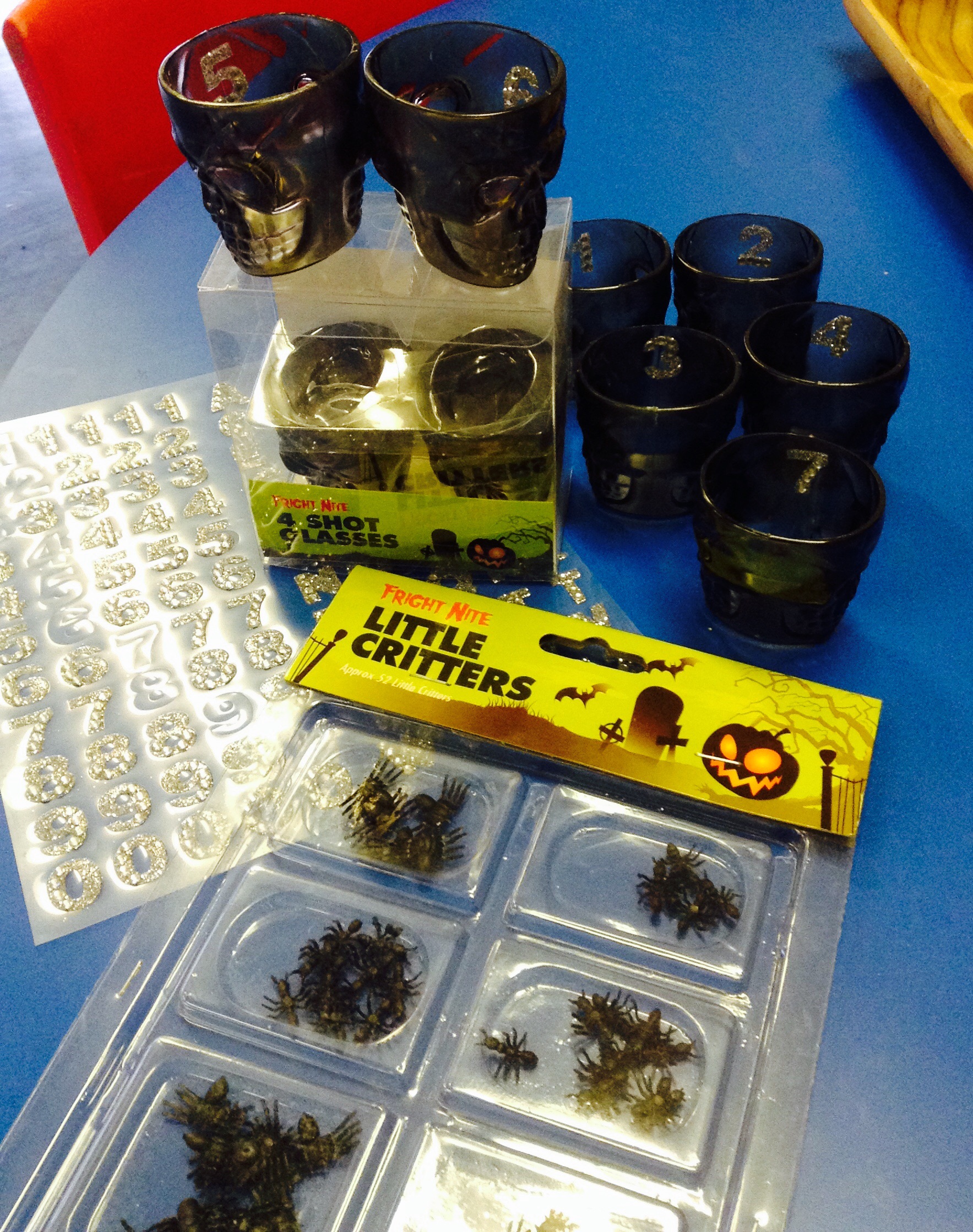 On on our funky fingers table I vagazzled some skull shot glasses that I bought in good old poundland and the children had to fill them up accordingly with spiders of varying sizes. Again differentiated tools were provided.